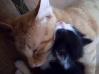 生後間もなく保護し、間もなく里親募集開始の仔猫(白黒♂)と一緒にオネムのうーろん(茶トラ♂)